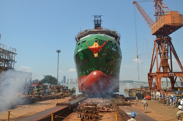 自2015年6月9日上船臺以來,歷時三個多月的船臺大合攏,目前以較高的船臺完整性順利下水,即將進入全面舾裝階段。計劃在2016年1月中旬試航,3月份具備交船條件。